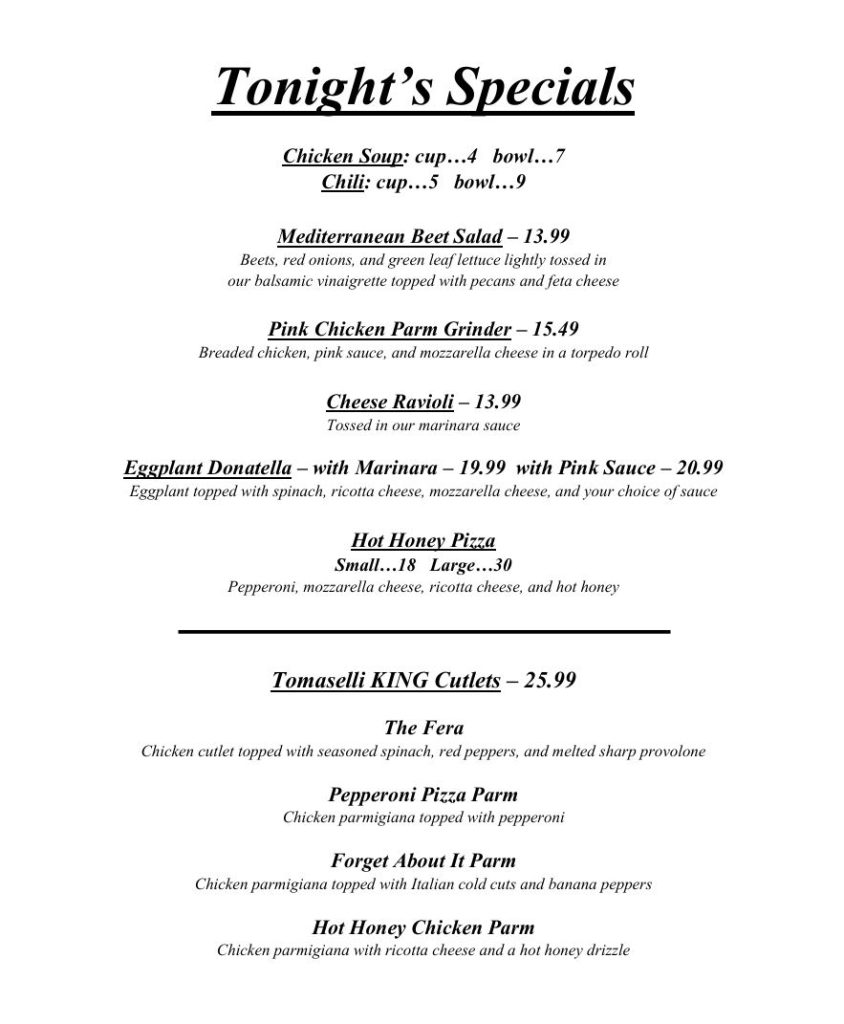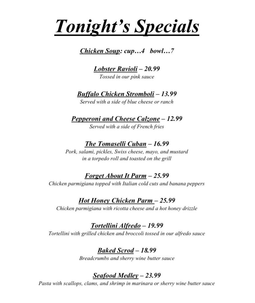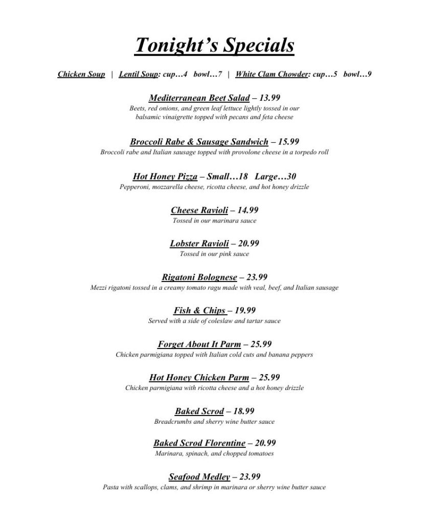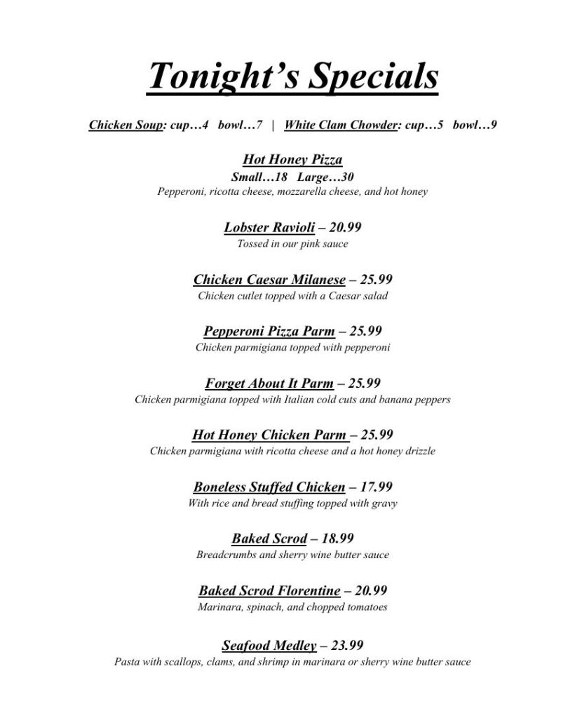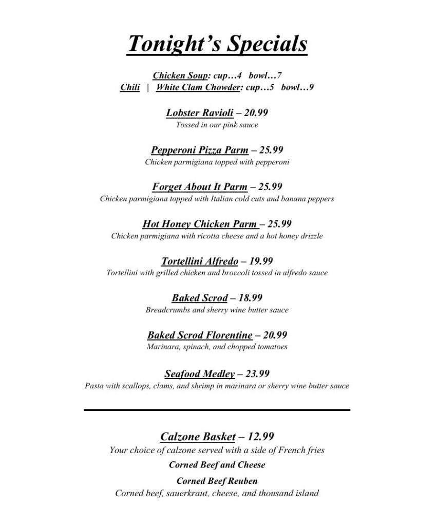 - Appetizers, Antipasto, Wings, Pizza, Grinders, Burgers, Pasta, Italian Entrees, Chicken/Veal Parmigiana